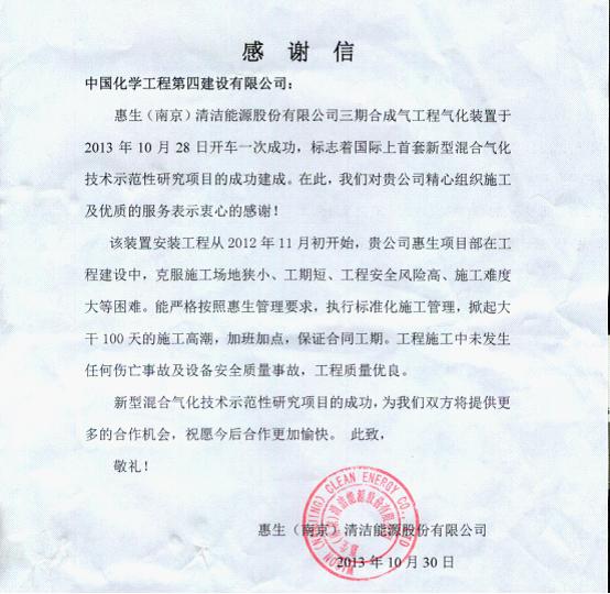 氣化裝置是繼其他各套系統開車成功后最后開車的核心裝置。它的成功開車標志著全部施工任務圓滿完成。分公司在該項目上創造了工程進度、質量安全、業主服務三個一流,用心血和汗水為業主奉獻了精品工程,展示了化建湘軍的風采,更獲得了業主來信高度贊揚!