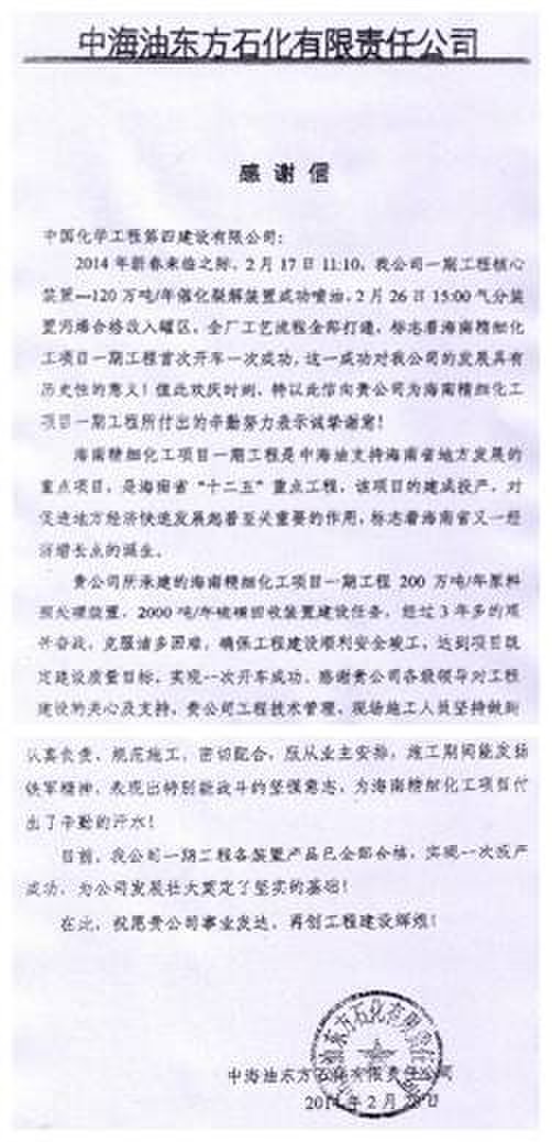 自2010年8月11日開工以來(lái),項(xiàng)目部在分公司經(jīng)理陳文彬、項(xiàng)目經(jīng)理劉興陽(yáng)的領(lǐng)導(dǎo)下,艱苦奮戰(zhàn)、精心組織、精細(xì)管理,工程整體形象良好、工程建設(shè)程序規(guī)范、質(zhì)量控制到位,于2013年9月28日按期順利實(shí)現(xiàn)機(jī)械竣工。通過投料試車,該項(xiàng)目達(dá)到一次試車成功、生產(chǎn)出合格產(chǎn)品的良好效果,受到了中海油東方石化有限責(zé)任公司的來(lái)信稱贊。