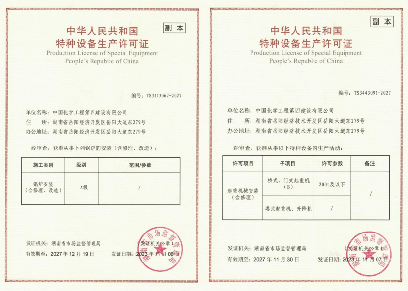 11月10日,公司收到湖南省市場監(jiān)督管理局頒發(fā)的鍋爐安裝(含修理、改造)最高資質(zhì)(A級)證書和起重機(jī)械安裝(含修理)資質(zhì)證書,標(biāo)志著公司鍋爐安裝和起重機(jī)械安裝許可證延續(xù)換證工作圓滿完成。