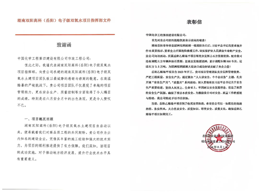 湖南雙陽(yáng)高科(岳陽(yáng))電子級(jí)雙氧水項(xiàng)目指揮部在致謝函中表示,在雙氧水項(xiàng)目建設(shè)期間,面對(duì)高溫酷暑的嚴(yán)峻挑戰(zhàn),市政公司項(xiàng)目團(tuán)隊(duì)展現(xiàn)出卓越的項(xiàng)目管理能力,在安全生產(chǎn)、質(zhì)量控制、進(jìn)度管理等方面贏得了相關(guān)各方的廣泛認(rèn)可,為項(xiàng)目順利推進(jìn)作出了突出貢獻(xiàn),謹(jǐn)向公司和項(xiàng)目部全體人員表示衷心感謝。