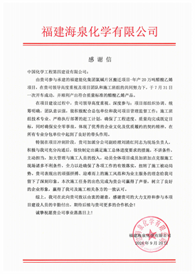 華南公司福建海泉化學(xué)醋酸乙烯項目收到業(yè)主感謝信