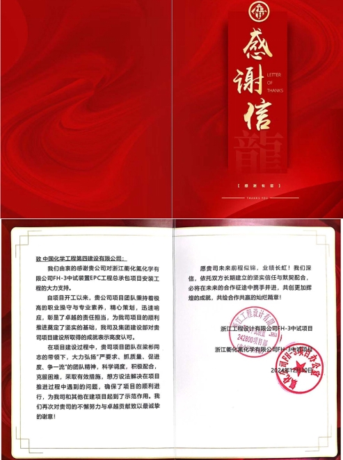 近日,華北公司收到浙江衢化氟化學有限公司及浙江工程設計有限公司發來的聯名感謝信,對衢化項目團隊在項目建設過程中作出的積極貢獻表示感謝。