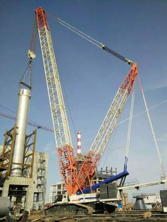 4日上午9時30分,470噸氨合成塔在800噸履帶吊主吊與130噸、180噸兩臺汽車吊抬尾的配合下緩緩吊起,下午3時整,穩穩就位在預定的位置,圓滿完成了吊裝任務。