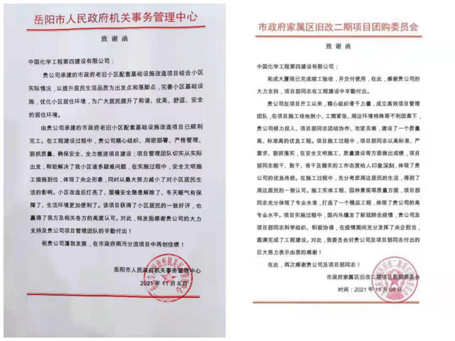 近日,建筑工程分公司和成大廈項(xiàng)目、岳陽市政府家屬區(qū)改造項(xiàng)目分別收到岳陽市政府家屬區(qū)舊改二期項(xiàng)目團(tuán)購(gòu)委員會(huì)、岳陽市人民政府機(jī)關(guān)事務(wù)管理中心送來的兩封致謝函。