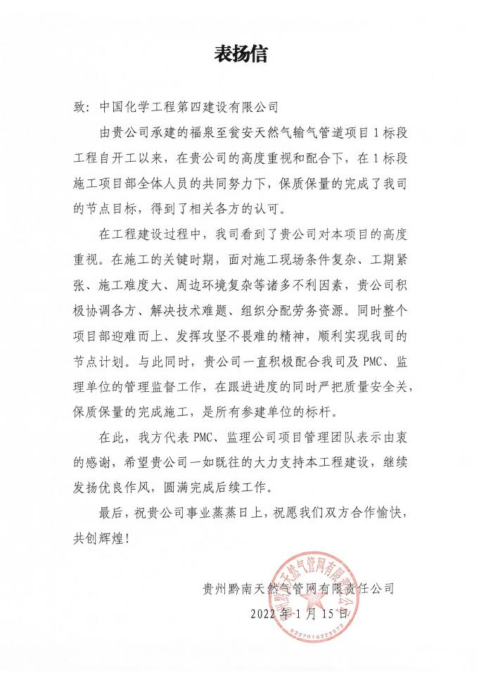 1月19日,由西部分公司承建的福泉至甕安天然氣管道項(xiàng)目收到貴州黔南天然氣管網(wǎng)有限公司發(fā)來的表揚(yáng)信。