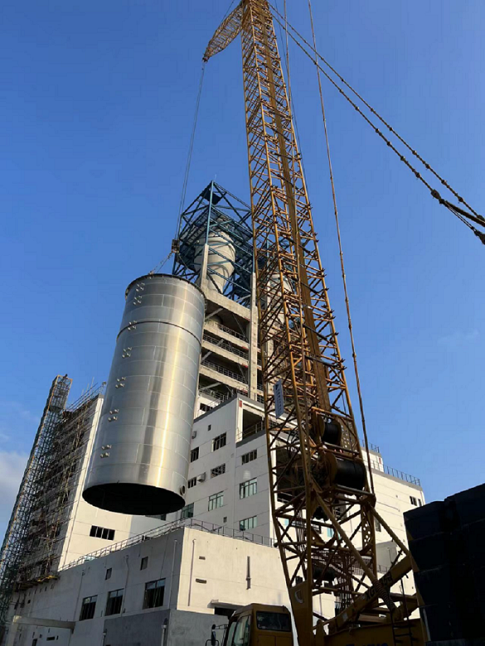 在項(xiàng)目現(xiàn)場(chǎng),處處呈現(xiàn)的是工人們不辭辛苦工作場(chǎng)景,白天進(jìn)行料倉(cāng)的吊裝工作,晚上加班加點(diǎn)進(jìn)行焊接、組裝。截至目前,已經(jīng)組裝好的8臺(tái)存儲(chǔ)料倉(cāng)完成了吊裝,余下的16臺(tái)存儲(chǔ)料倉(cāng)也將會(huì)于3月20日完成。同時(shí),正在緊張進(jìn)行12臺(tái)摻混料倉(cāng)撥罐施工,并計(jì)劃4月下旬完成所有摻混料倉(cāng)的吊裝施工。