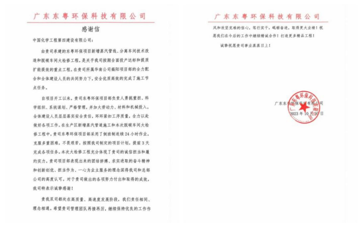 近日,華南公司收到廣東東粵環保科技有限公司發來感謝信,對項目部提前3天完成新增蒸汽管線、分離車間技術改造和脫碳車間大檢修工程表示誠摯感謝。