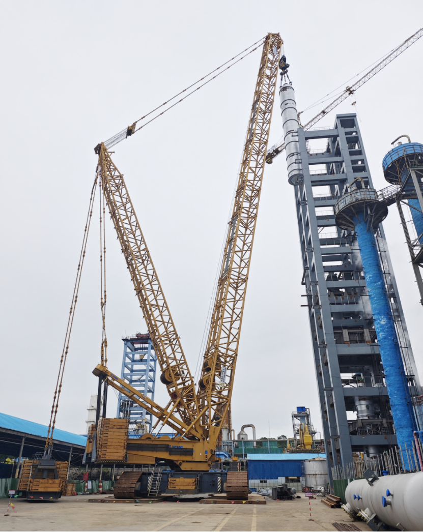 作為華強(qiáng)化工尿素生產(chǎn)線的“心臟”設(shè)備與整個(gè)升級(jí)改造工程的核心樞紐,此次吊裝的尿素合成塔高27.5米、直徑3米,其安裝精度直接關(guān)乎裝置投用后的運(yùn)行效能。為了確保一次順利將這臺(tái)核心設(shè)備吊裝成功,項(xiàng)目部前期反復(fù)論證、優(yōu)化專(zhuān)項(xiàng)方案,最終確定采用“雙機(jī)抬吊”工藝:以1250噸履帶吊為主吊設(shè)備,搭配900噸汽車(chē)吊協(xié)同溜尾作業(yè),精準(zhǔn)匹配設(shè)備重量與現(xiàn)場(chǎng)工況。同時(shí),項(xiàng)目部始終將“安全第一”貫穿全程,吊裝前嚴(yán)格開(kāi)展吊索具全面檢查,科學(xué)劃定警戒區(qū)域,明確各崗位操作規(guī)范,全程實(shí)時(shí)監(jiān)控吊裝姿態(tài)與受力情況,最終實(shí)現(xiàn)設(shè)備“零誤差”精準(zhǔn)落位,整個(gè)作業(yè)安全高效、一氣呵成。